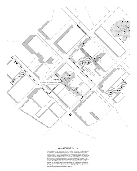 This project intends to subvert the normal patterns of a city by hiding a residency in the void space of one block. Inspired by precedent research into Chicago's Tent Cities, this work uses tactics such as false facades, construction, and signage to hide the community in plain site. Unused parking lots, alleys, and blind spots created by the surrounding permanent architecture become a new unwitting home to a new kind of community.